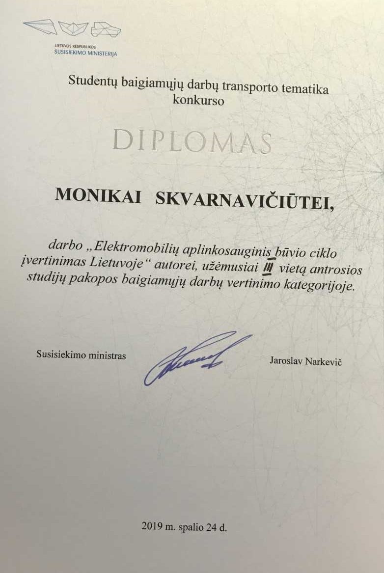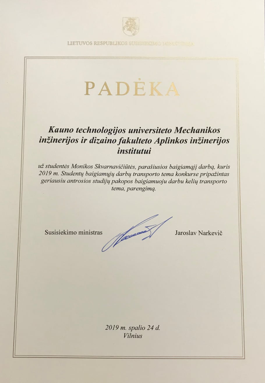 We would like to welcome Monika Skvarnavičiūtė (Supervisor, Prof. Dr. Jolanta Dvarionienė), a student of APINI Master’s Degree Program in Sustainable Management and Production, whose Master’s Thesis is on Transport of Graduate Theses in the Competition organized by the Transport Ministries Recognized as the Best Postgraduate Thesis on Road Transport!